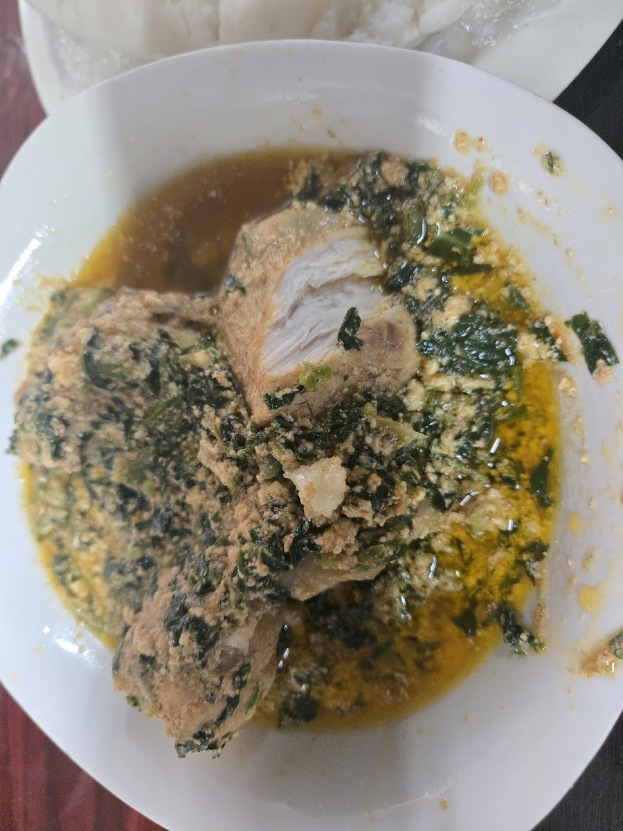Vegetable soup made with palm oil and dried fish and mixed meat. Served with your choice fufu, garri, wheat fufu, oat fufu.