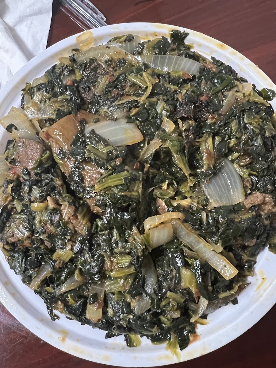 Fresh African spinach cooked with peanut, onion, beef, and shrimp. Served with your choice fufu, garri, wheat fufu, oat fufu.